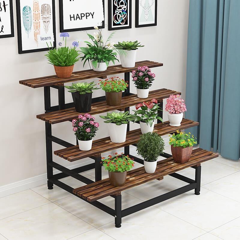 Flower Rack Iron Art Living Room Flower Rack Indoor Multi-layer Solid Wood Steel Wood Flower Rack Balcony Pot Rack Ladder Four Layers Thickened 120 Long